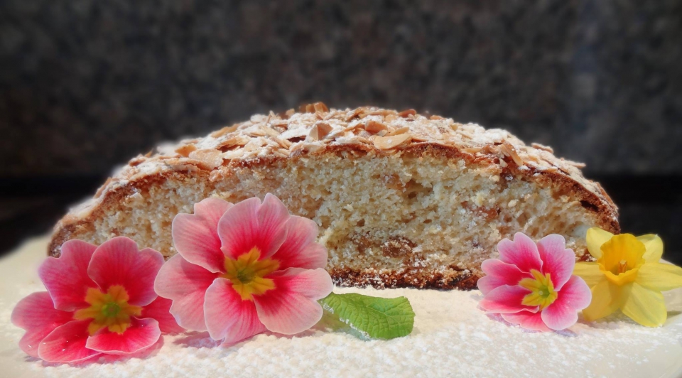 Na vál dáme 3 lžíce hladké mouky a vytvoříme z těsta bochánek. Bochánek uprostřed nastřihneme malým křížkem, potřeme žloutkem rozšlehaným s trochou mléka a posypeme mandlemi.