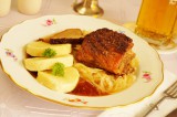 Bůček osolíme, okmínujeme, potřeme rozmačkaným česnekem, podlijeme vodou a dáme péct do trouby. Průběžně přelíváme výpekem, aby se udělala hnědá kůrčička.