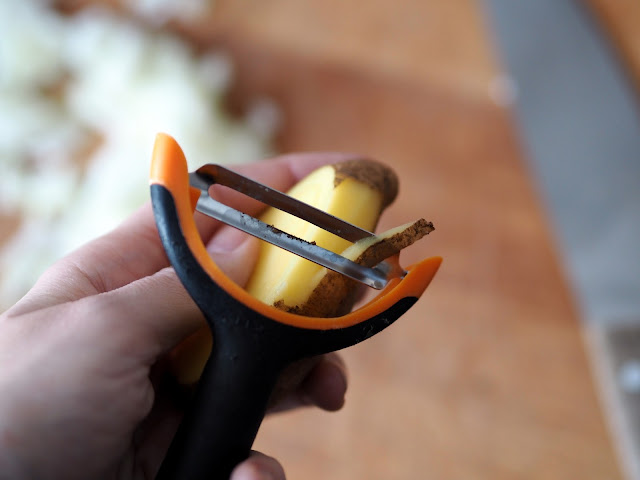 Když je cibule zlatavá, tak k ní přidáme mrkev a brambory a ještě chvíli restujeme.