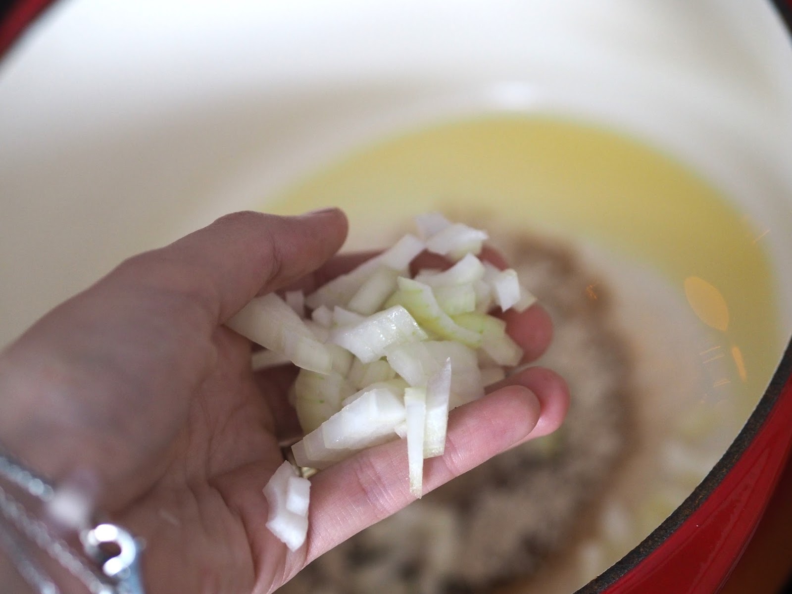 Rozpálíme si hrnec, přidáme olivový olej a cibuli, kterou restujeme do zlatava.